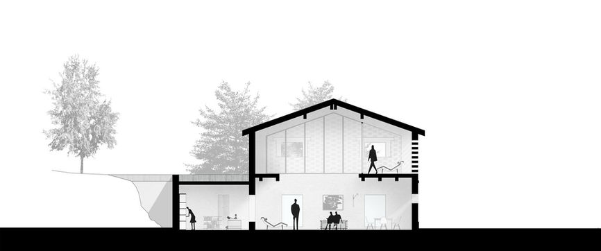 Il nuovo volume, aperto per godere della vista verso valle e illuminato lateralmente dal patio e da un secondo piccolo cavedio, verso la strada resta chiuso e la sua parete si integra con il giardino retrostante diventando supporto per permettere la crescita della vegetazione spontanea. All’interno gli spazi sono riorganizzati con una zona giorno a doppia altezza nel volume del vecchio fienile, per sfruttare la suggestiva atmosfera luminosa del grigliato e consentire allo stesso tempo di godere della vista verso valle attraverso grandi aperture.